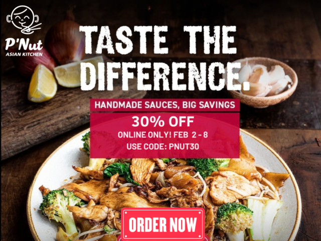For a limited time, you can enjoy 30% OFF all online orders at P’Nut Asian Kitchen by using promo code PNUT30 at checkout.