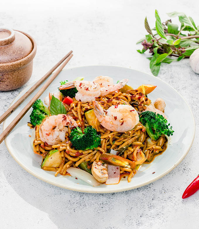 Chilli Basil Noodles features homemade chilli paste tossed with hokkien noodles, Thai basil and egg. The natural heat from chilli will warm you up, and fun fact – this dish is traditionally eaten in Thailand to cure hangovers!